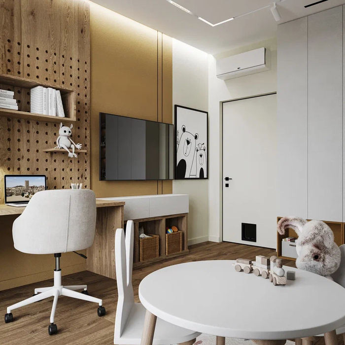 Детская решена в светлой палитре с акцентами жёлтого и древесного оттенка. Планировка продумана так, чтобы ребёнку было удобно играть, заниматься и отдыхать. Рабочая зона оборудована столом с перфорированной панелью для хранения аксессуаров.