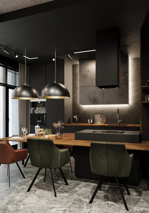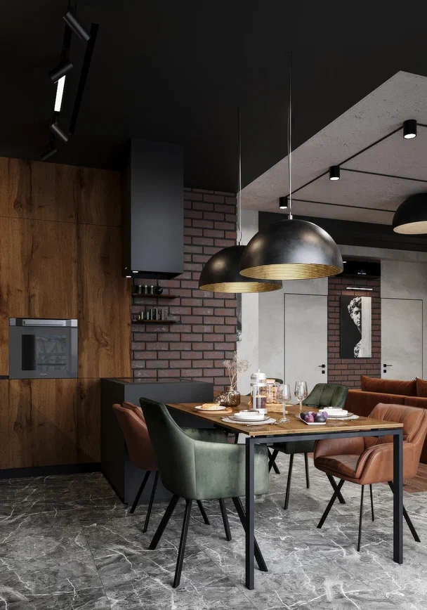 Кухня-гостиная спроектирована как единое пространство, в котором зоны готовки, обеда и отдыха плавно переходят одна в другую. Центральный элемент — большой деревянный стол, переходящий в остров, который разделяет помещение на функциональные блоки. В отделке использованы кирпичные и деревянные поверхности, создающие выразительность.