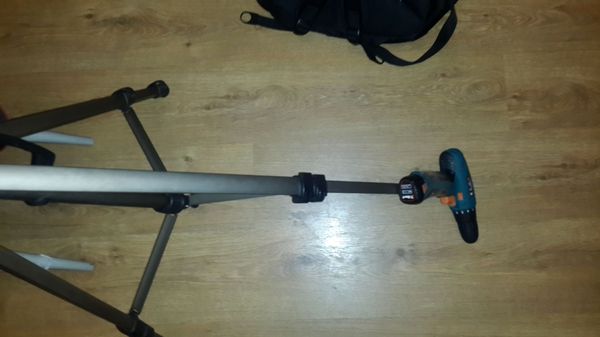Закрепляем на штативе, т. к. центр тяжести смещен вперед, то в качестве противовеса примотаем к задней ноге штатива, что-нибудь тяжелое. Я примотал шуруповерт.