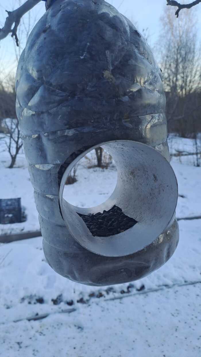 Предисловие. Работаю в детском саду, и лет так 6-7 назад, у нас была ( Свердловская область), достаточно морозная( -25, -30,) зима.А птиц синиц, старались подкармливать регулярно. Но вот, новогодние праздники, которые 10 дней, и понимаешь, что на работу ходить не будешь, а синицы приученные, стаями летают..Стали думать над кормушкой, чтоб хоть неделю не наполнять ее, и вот что надумали..Конструкция, конечно, страшна, но показала себя на 👍
