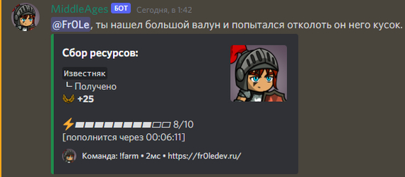 А командой !farm, можно собирать ресурсы