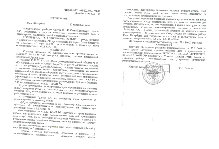 «В полиции просто отказали в возбуждении дела - якобы ждали заключения медиков, затем эти заключения не очень быстро забирали, и так же медленно отправляли в судмедэкспертизу – для определения тяжести нанесённого вреда… так настал декабрь, и 27.12.2024 было написано заявление в Прокуратуру - на 23 отдел полиции Невского района, в связи с тем, что дело затягивают без рассмотрения. Прокуратура ответила в феврале 2025, что дело вернули в полицию на доработку, и только в начале марта 2025, оно оказалось в суде. Но суд так же вернул дело в Полицию, потому что сотрудники Полиции «потеряли» половину материала дела.»