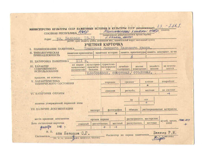 В 1986 году министерством культуры СССР комплексу была выдана учётная карточка по фактическому адресу улица Деловая 13-15 как памятнику культуры, по характеристике технического состояния отметка находилась в положении «плохое». В категории современного использования числились хлебозавод, спортзал и столовая. Памятником архитектуры комплекс стал после постановления совета министров ТАССР от 27.07.1987 года № 320. Категория охраны: региональная. Ильшат Васильев снова оказал помощь в прояснении ситуации с эксплуатацией: