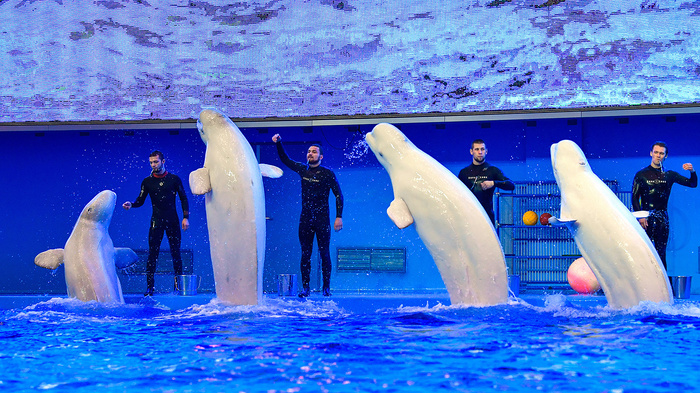 Дельфины и белухи обладают не меньшим арсеналом навыков. Дельфины, например, с удовольствием рисуют картины: тренер держит лист бумаги и подаёт «мастеру» инструменты, а животное водит зажатой в зубах кистью по полотну. Получившееся творение становится подарком зрителю, назвавшему имена каждого из четырёх дельфинов. Белухи исполняют, пожалуй, самый романтичный номер — поцелуй с тренером. А после они вместе «танцуют» в аквариуме.