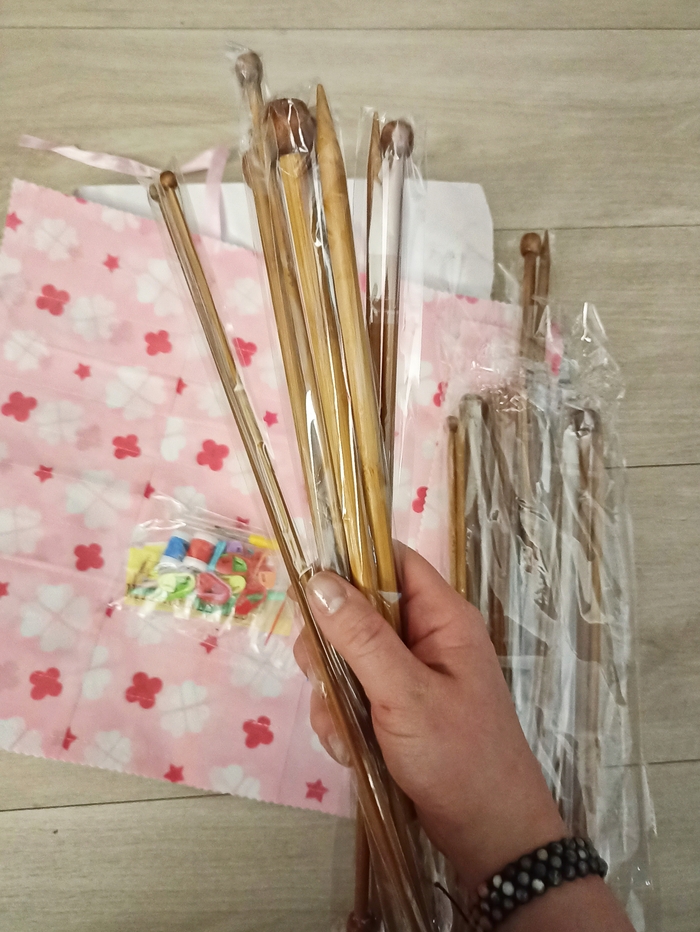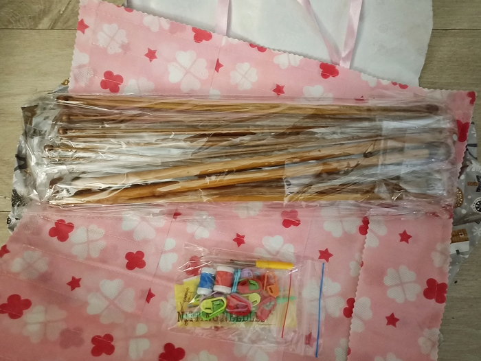 В одном из загадочных свёртков лежало 18!!! пар шикарных бамбуковых спиц и небольшой наборчик из мелких принадлежностей для вязания (маркеры, счётчики петель, иглы для аранов, распарыватель и что-то ещё). Всё это было завёрнуто в чехол для спиц. Вопрос с отсутствием подходящих для той пряжи спиц закрыт. 😄