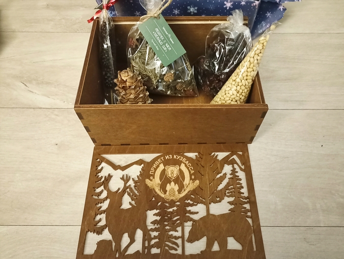Ага, ящик местных вкусностей! Кедровая шишка и кулёк кедровых орешков (сразу скомуниздил муж), травяной чай, сушеные ягоды, которые нам не удалось опознать, и цукаты из шишек! Я очень люблю варенье из сосновых шишек и давно поглядываю на такие цукаты. Теперь можно их попробовать и решить, стоит ли брать. 😄