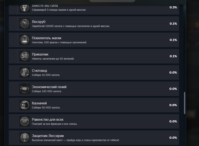 1) Достижения. Ух, появились ещё в том тесте. В целом неплохие, да, много вроде бы незамысловатых и в стиле "Добей ХХХ крипов", но меджестиподобные игры минмаксерские, минусов не вижу. Ачивки получать приятно