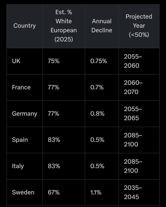 За основу расчетов взята оценка текущей доли населения европейского происхождения, а также средние темпы её сокращения в год. Грубая арифметическая прогрессия позволяет допустить, что европейское население перестанет быть большинством во всех крупных странах Западной Европы до конца текущего века. Однако для реализации сценария должны сохраниться текущие темпы иммиграции, которые зависят от разницы в уровне доходов в государствах, а также в наличии избытка рабочих рук в развивающихся странах — относительно обоих параметров имеются сомнения.