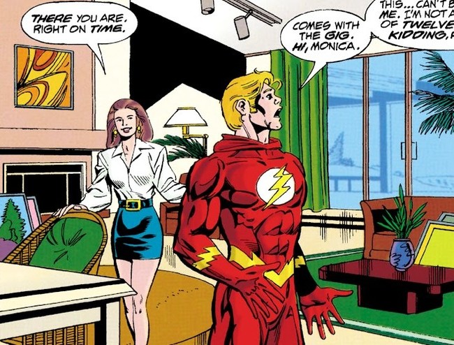 Обложка комикса The Flash #123 отсылает к обложке 123 выпуска первого тома комикса про Флэша и истории «Флэш двух миров». В общем, Флэш осваивается в Санта Марте, своём новом (как он надеется – временном) доме (мэр Кейстоуна недоволен тем, что Флэш возвращается в город поспать – но пока официального приказа об изгнании нет, ничего не попишешь). Кстати, о доме – ему там за бесплатно выдали внушительных размеров особняк (в нём офис не хуже, чем у Брюса Уэйна, с атомным хронометром) и личную секретаршу. И казалось бы, Санта Марта – тихий городок, и для Флэша тут и работы-то не будет…но тут объявляется тиранозавр. Причём достаточно плотный для того, чтобы сеять разруху, но при этом недостаточно плотный для того, чтобы его можно было ударить. Странное дело…бахнув динозавра током от ближайших проводов, Флэш добивается того, что чудище исчезает…и причинённые им разрушения тоже. Ну, кроме рухнувшего моста, но он рухнул, потому что по нему бежала большая толпа народу в панике.