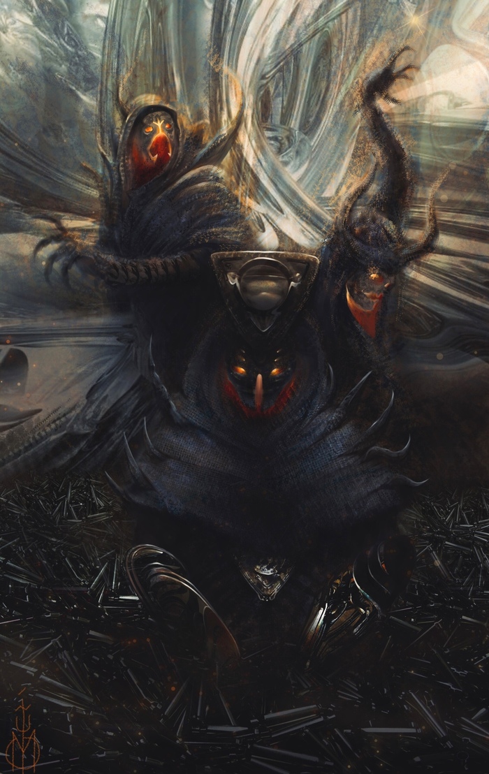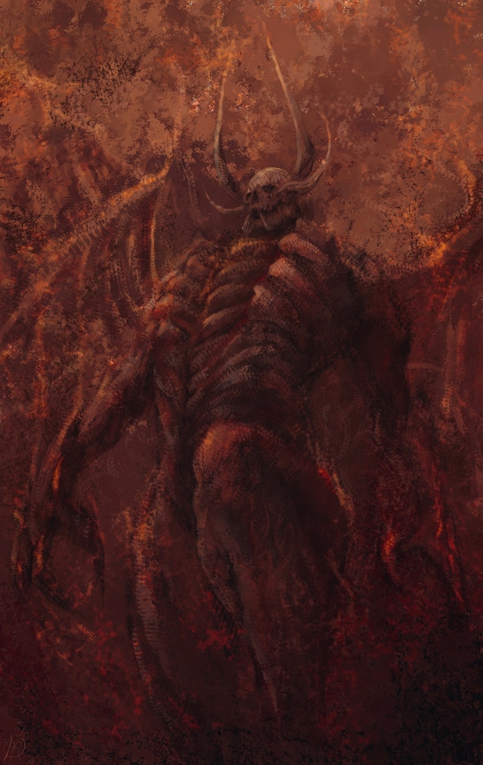 Врата снова зарябили, и сквозь них на горящую землю тяжело ступил центурион штурмового легиона. Массивный, черный, как сама Тьма, искусно отлитый из невероятного сплава тяжелых и редкоземельных металлов полный доспех восьмиметрового кастигатора украшали многочисленные цепи и шипы. Когтистая лапа крепко держала исполинский щит с золоченым сигилом Молоха на умбоне, по обе стороны от него поблескивали серебром сигилы примарха легиона и легата когорты. Вдоль его оковки резцами лучших кузнецов Тартароса были выгравированы слова Изначальной Речи. Их нечестивые глифы раскаленными гвоздями вонзались в мозг, вызывая нестерпимое желание выдрать себе глаза и погружая в пучины безумия лишь попыткой их прочесть. В другой лапе лежал четырехметровый клинок – вокруг раскаленного добела лезвия клубился черный туман. Кожистые крылья демона стягивались побагровевшими от жара стальными цепями. За его спиной находился колчан с огромными копьями.
