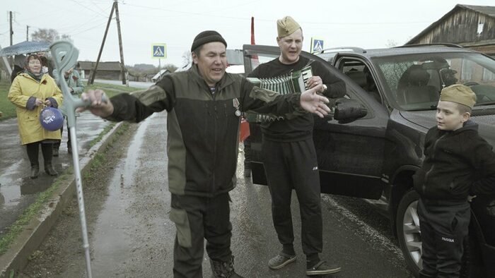 Машины с флагами останавливаются у входа в парк. Из-под лобовых стекол глядят портреты ветеранов, белеют надписи: «За Победу! За мир!» Из черной иномарки выпрыгивает мужчина в фирменном свитере BMW и советской пилотке, с гармошкой на ремне. В такт гремящему из динамиков «Дню Победы» он со всей дури жмет на клавиши, издавая дикие, но ритмичные звуки.