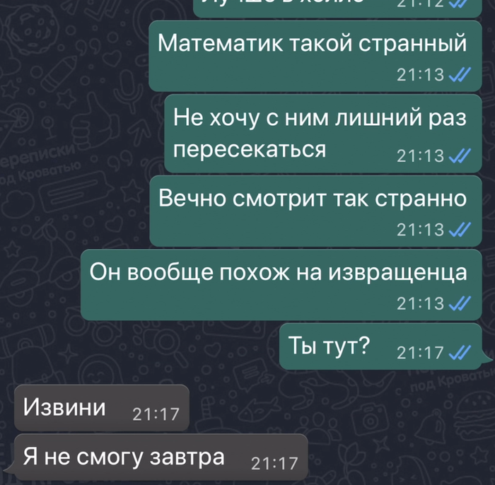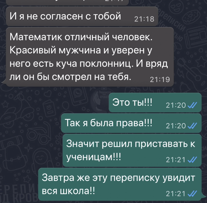 Не! Я пытался сдерживаться. Дождался звонка на урок и отправил в общий чат просьбу, отправить мне всех мальчонок с 6 по 11 класс на беседу. К дверям несчастного туалета.