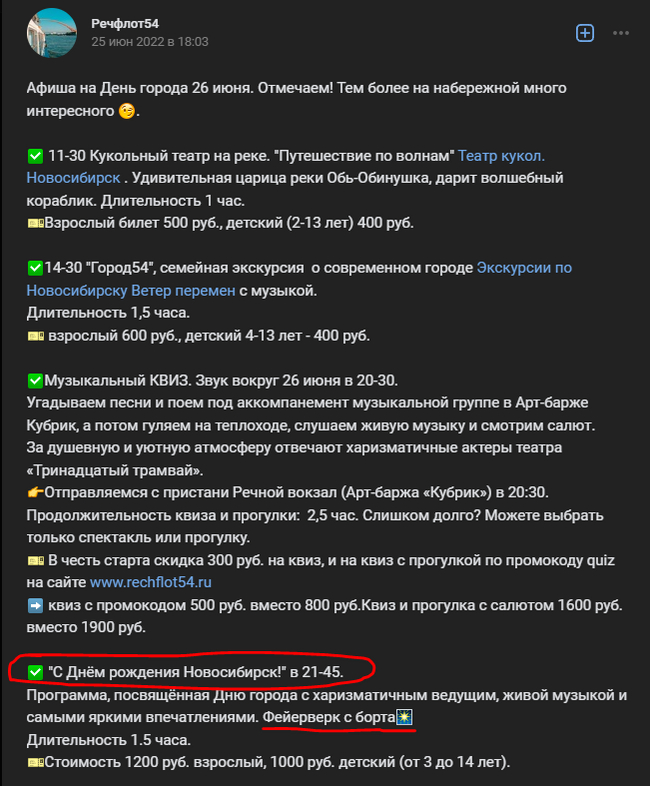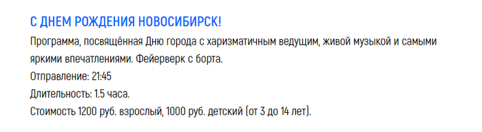 Мы с женой уже были на городском празднике в Новосибе, в том числе и на набережной. Но наблюдать фейерверк на плотно забитом людьми, относительно нешироком участке - удовольствие сомнительное. И тут на глаза попадается объявление от РечФлота.