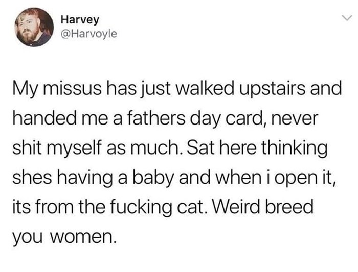 7 Жена только что поднялась ко мне наверх и вручила открытку ко дню отца, я чуть не обкакался. Сижу думаю она ждёт ребенка, открываю открытку, а это от моего долбанного кота. Странные вы женщины.