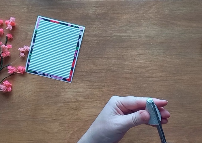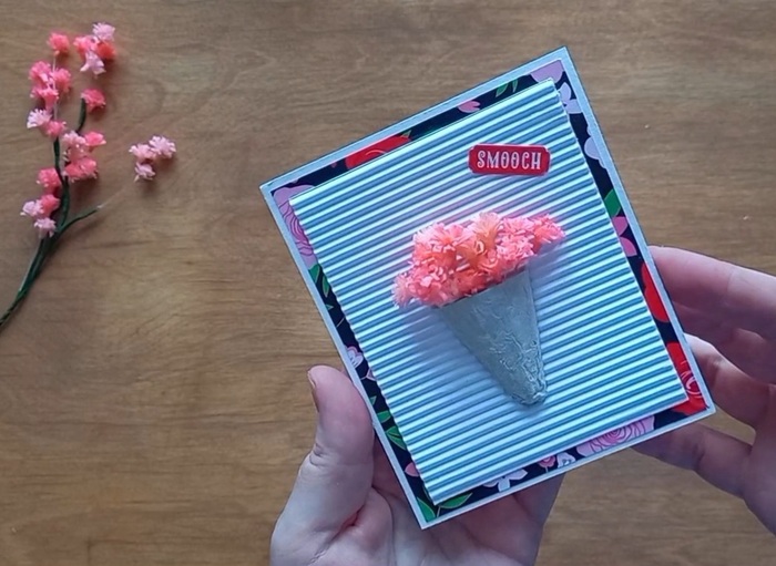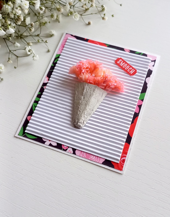 Размечаем примерно середину на основе открытки. Проклеиваем на горячий клей цветы и конус от картонных ячеек. Конус лучше раскрасить, я оставила как есть.