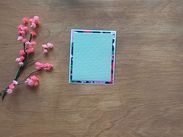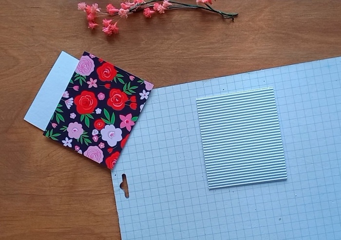 На белый картон наклеиваем цветную бумагу и гофрированный картон белого цвета, оставляя одинаковые зазоры по краям. Это будет основа открытки.