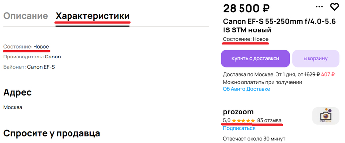 Искал себе объектив Объектив Canon EF-S 55-250 F4-5.6 IS STM. У одного из продавцов prozoom только с 5-ти звездными отзывами такой объектив продается по 28,500 руб.