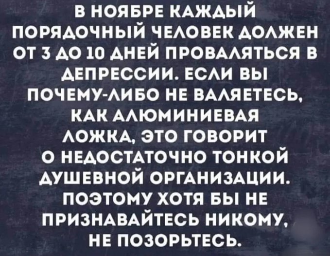 Да какая блт депрессия, у меня все хорошо же. Мне бы мельдоний может попить и в санаторий съездить отдохнуть. Хрен там плавал, депрессия!