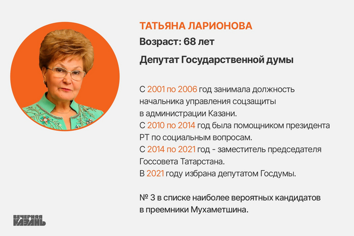 В последние годы отчетливо наметился тренд назначения на руководящие должности в Татарстан управленцев, чей карьерный путь не пересекается с республикой. Это добавляет интриги в вопрос о новом руководителе Госсовета - не решится ли федеральный центр сделать ход и предложить своего кандидата? Впрочем, опрошенные «Вечерней Казанью» собеседники полагают, что вряд ли на столь значимый для республики пост назначат человека с такой уже знакомой для региона характеристикой «варяг». Но с подачи «руки Москвы» преемником Мухаметшина могут рекомендовать назначить политика, работавшего за пределами республики. Говоря о таких кандидатах, стоит отметить депутата Госдумы Татьяну Ларионову. Большая часть ее карьеры прошла, что называется, в «социальном блоке». У Татьяны Петровны есть опыт работы в Госсовете не только депутатом, но и заместителем председателя. Кстати, с тех пор в заместителях Фарида Хайрулловича ходят одни мужчины. Вот и повод в духе феминистической повестки назначить женщину на третий по значимости пост в республике. Вдобавок Ларионова в качестве преемника Мухаметшина могла бы стать компромиссным вариантом между Казанью и Москвой. В 2021 году, несмотря на позицию своей «Единой России», проголосовала против пакета законов о публичной власти в регионе, из-за которого, в частности, было изменено наименование должности главы Татарстана. Так что, несмотря на работу в федеральном парламенте, об интересах республики Ларионова тоже не забывает.