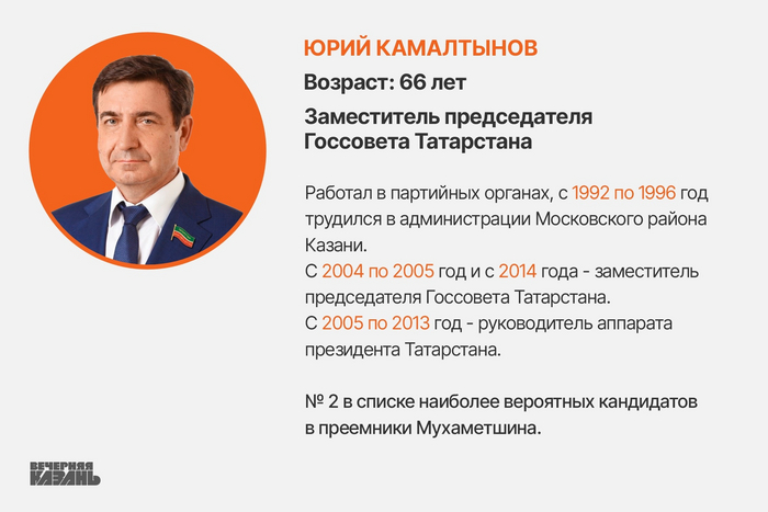 Фигура Юрия Зимелевича при обсуждении потенциальных преемников Мухаметшина всплывает довольно часто. За Камалтыновым не только должность одного из заместителей председателя Госсовета, но и опыт работы в местной власти, республиканском парламенте и аппарате президента Татарстана. При обсуждении возможного преемника Фарида Хайрулловича Камалтынов идет строго за кандидатом № 1 в нашем рейтинге. За него играет большой опыт аппаратной работы. Впрочем, это же может быть и минусом - все-таки должность председателя Госсовета публичная, а аппаратная деятельность подразумевает под собой работу под покровом тайны. И, кажется, произносить яркие речи с высоких трибун Камалтынову нравится меньше, чем его коллеге по должности заместителя Госсовета.
