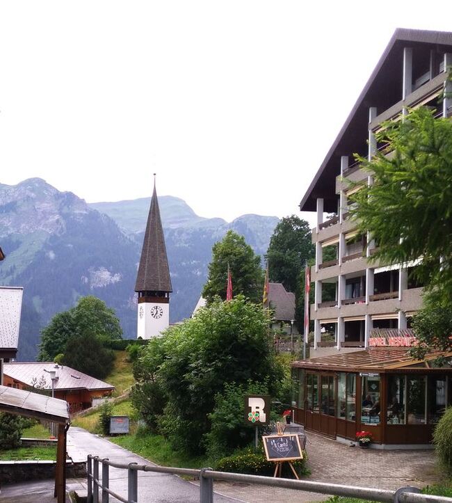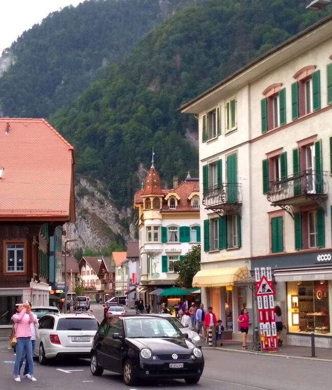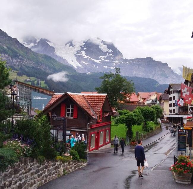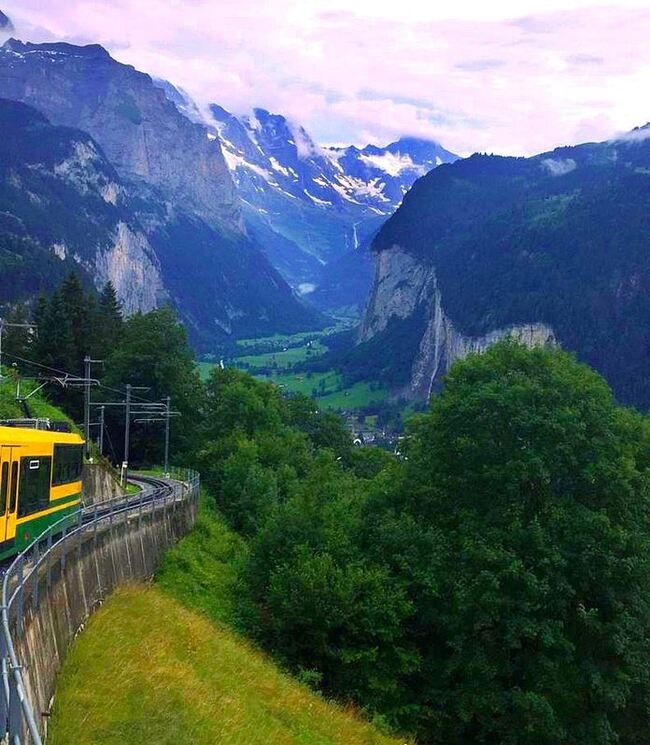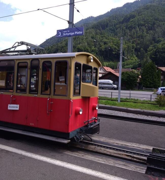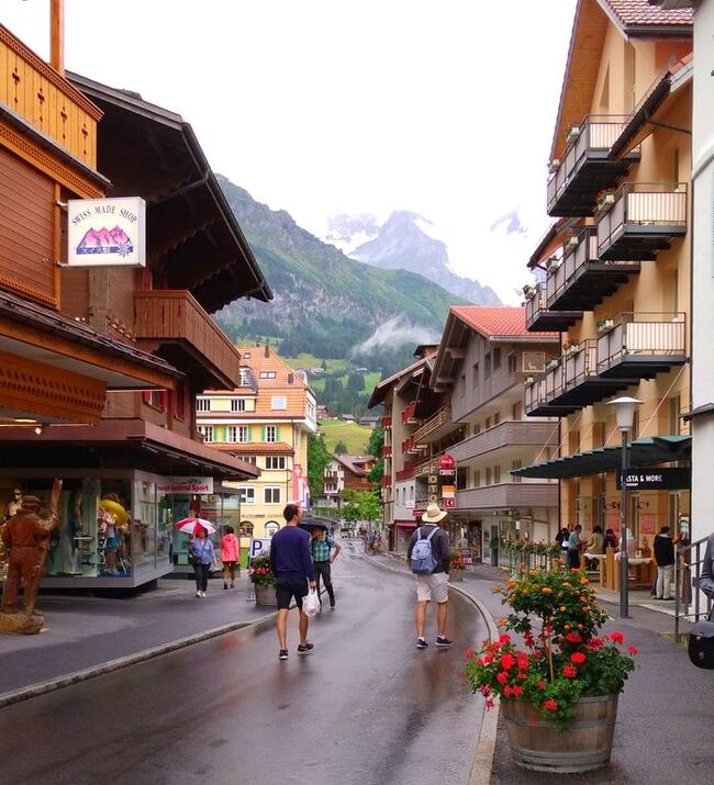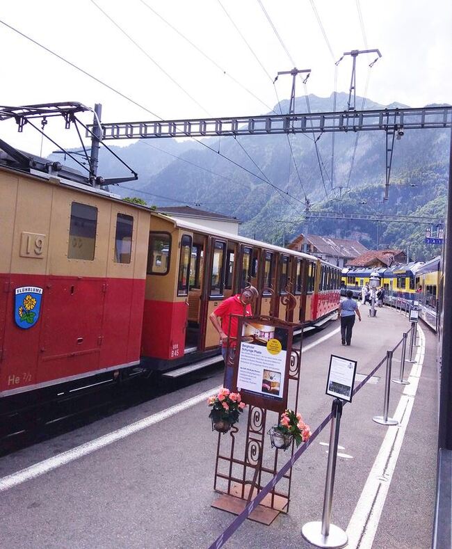 Венген тоже очень красивый, и виды с поезда удивительные. Решено взобраться повыше к горе Юнгфрау. Добрались до промежуточной станции Венген на таком ретро-поезде. Автомобили там не ездят, только фуникулер или поезд. Начался дождь и пришлось ехать вниз обратно. Гора показала нам средний палец, и затянулась глубоким туманом.