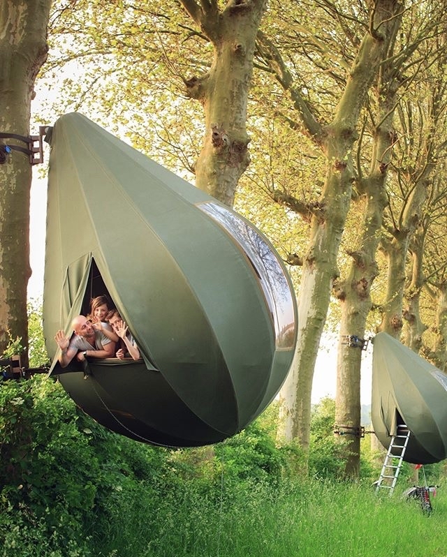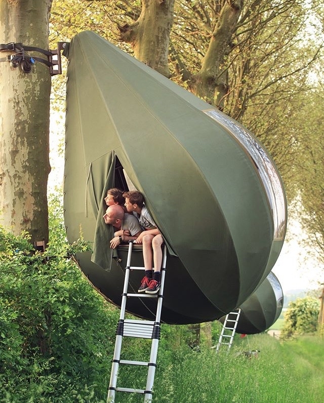 Каждая «капля» крепится к дереву и имеет место внутри для двух взрослых и пары детей. Матрас, скамейку и окно, чтобы наблюдать за природой вокруг и звёздным небом ночью.
