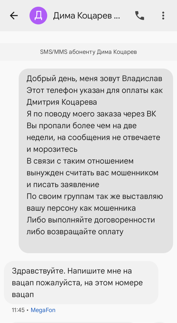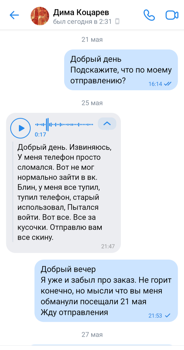 Дальше тишина. Сообщения в ВК до сих пор не прочитаны. Пришлось этого ухаря искать в других мессенджерах и там спрашивать ответа