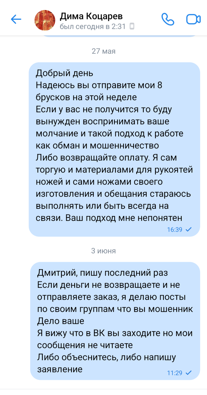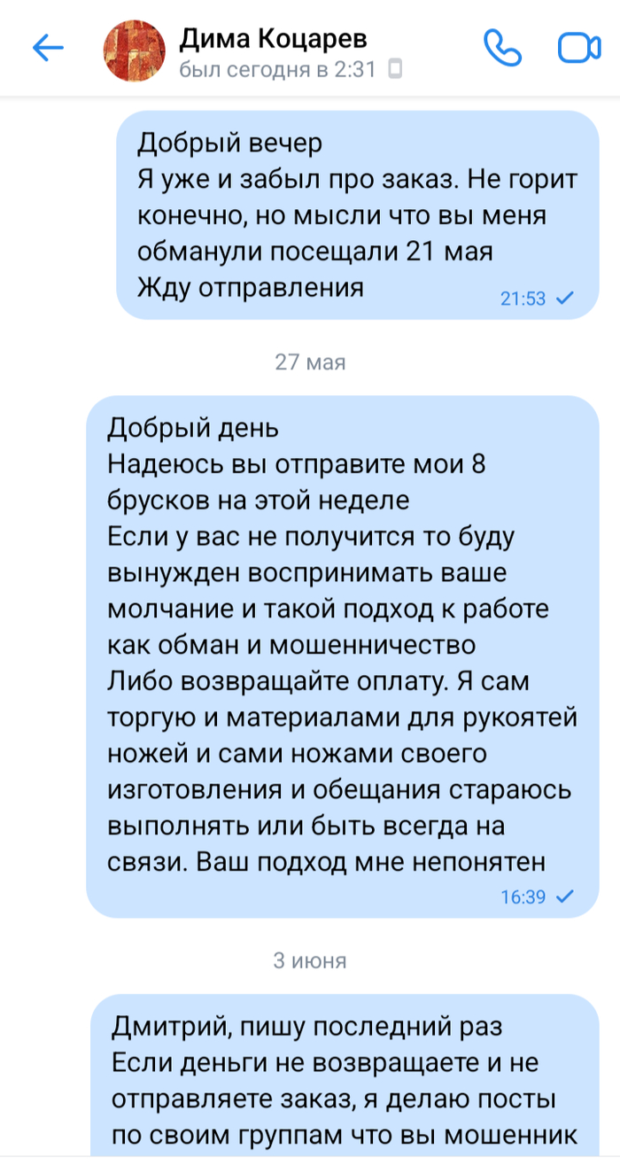Написал пост, примерно как этот, в барахолки и группы по ножам где обитаю. Многие люди написали что это не сильно но известный персонаж. Мудак одном словом и многие до сих пор так же ждут свои бруски или свои деньги обратно.