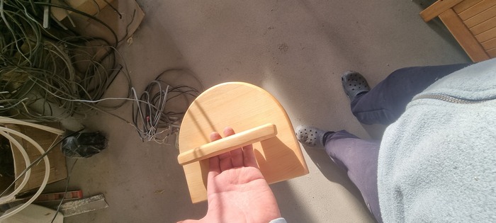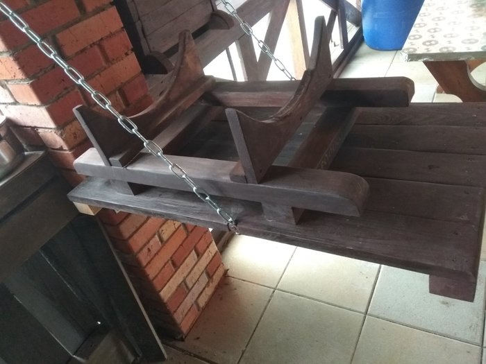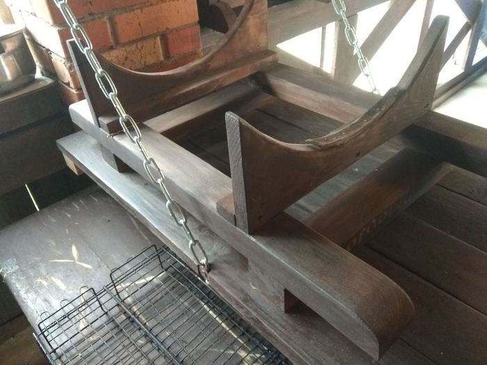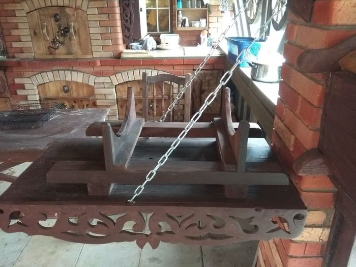 Вывесил подставку в виде крышки стола .Закрепил на цепочках к балкам. Бока столешницы украсил орнаментом . Доска,карандаш лобзик ... Дело не хитрое.