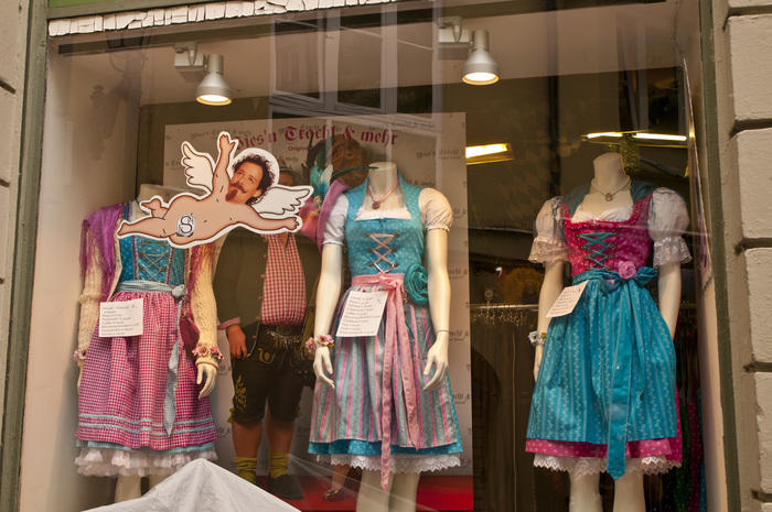 Магазин, в котором продают национальную баварскую одежду дирндль. Ангелочек с лицом мужика -- это, якобы, лицо хозяина магазина. Мы не проверяли, так ли оно на самом деле :)