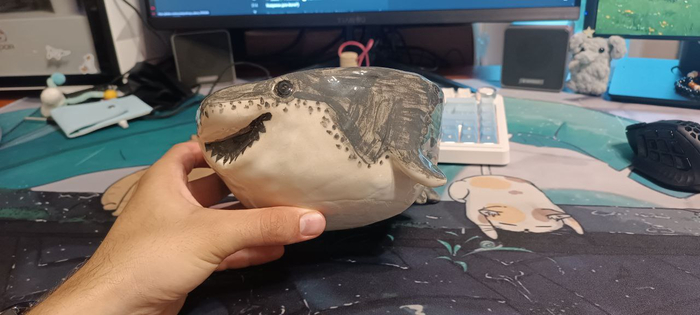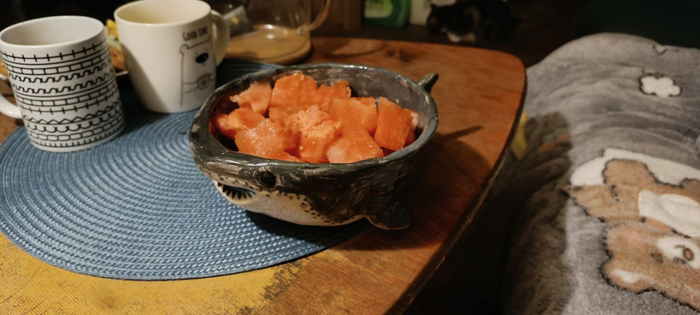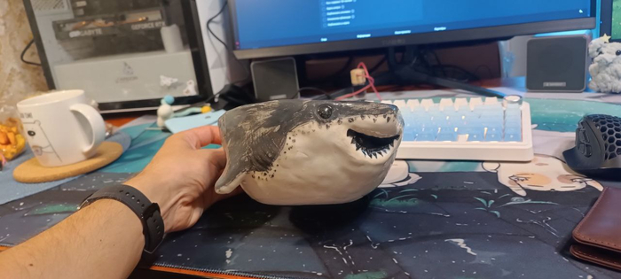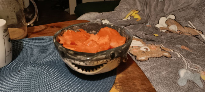 Увидев эту прекрасную тарелку загорелся идеей заполучить себе такую же. Её я заказал через интернет у первой попавшейся девушки занимающейся лепкой из глины. Стоимость вышла 1100 р из русской глины. Я не настаивал на точном следовании оригиналу. Она получилась прикольной, хоть и сильно отличается от картинки. Думаю попробовать ещё самостоятельно реализовать позже. Вот несколько фоток. Очень прикольно есть арбузик. Ощущение что ешь внутренности незадачливого купальщика.