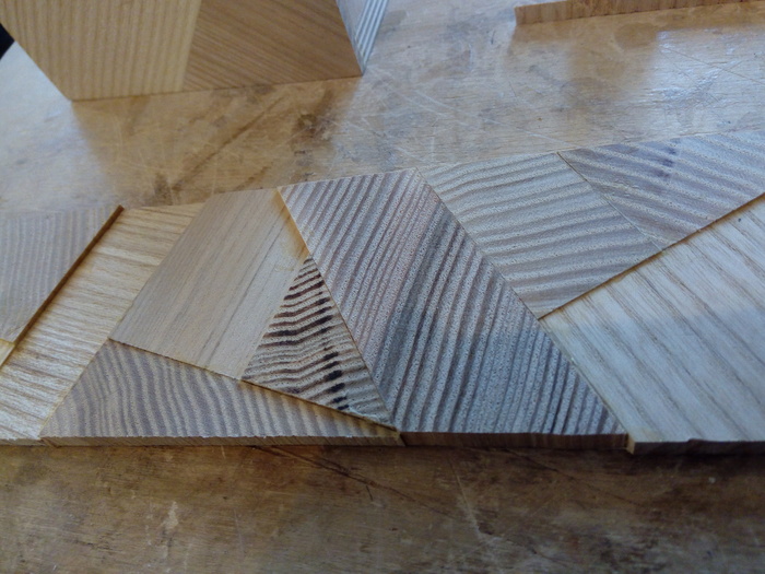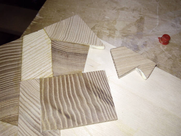 Значит пойдем по другому пути. Сначала склеим щитки в торец, а уже потом приклеим щитки к заготовке. Так получилось гораздо проще и лучше. Хотя щиток тоже деформировался, но прижать его оказалось гораздо проще, чем отдельные детали.