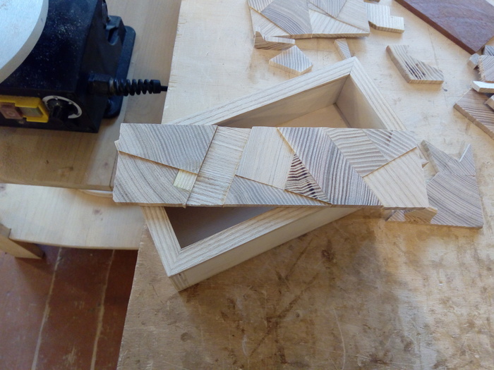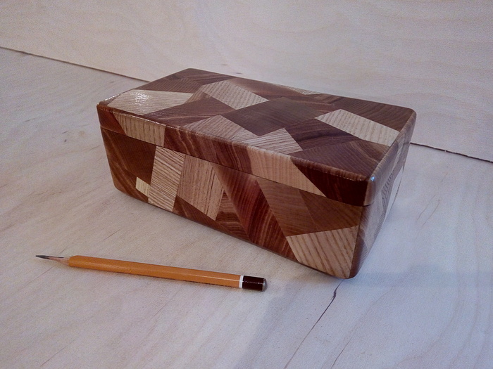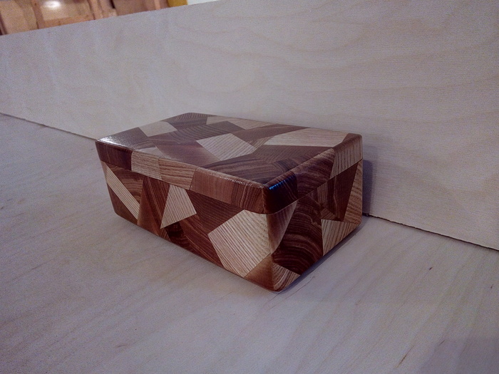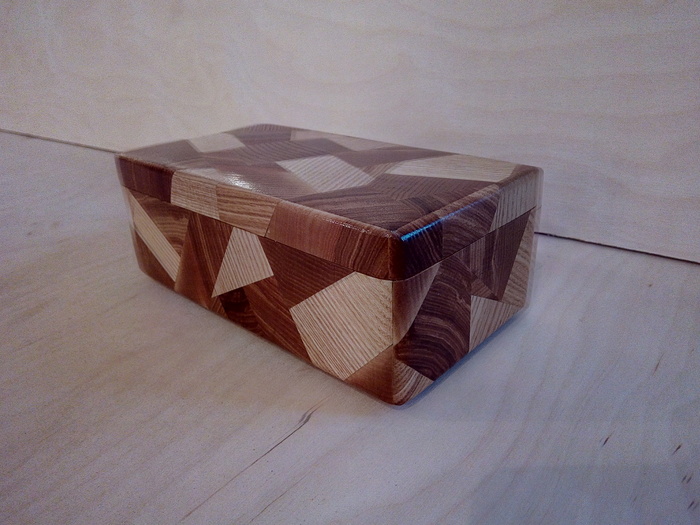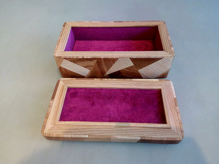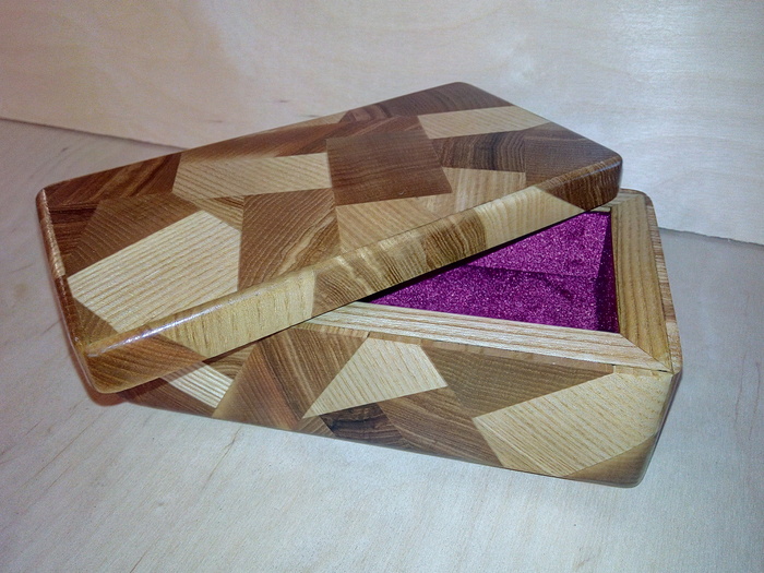 После приклейки щитков, зашкурил и зашлифовал выступающие части. Крышка изготовлена точно так же. Внутри отделка бархатом. Пропитал маслом и залачил (масло, лак прозрачные). Получилась довольно интересная по цвету шкатулка. При изготовлении использовал только Ясень (не считая фанерной заготовки)