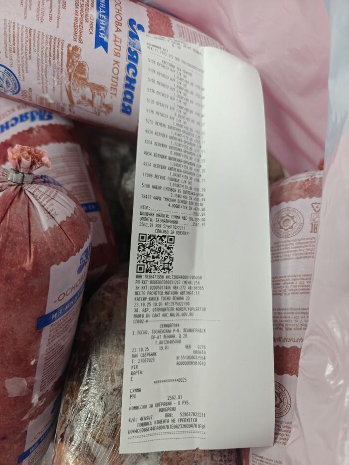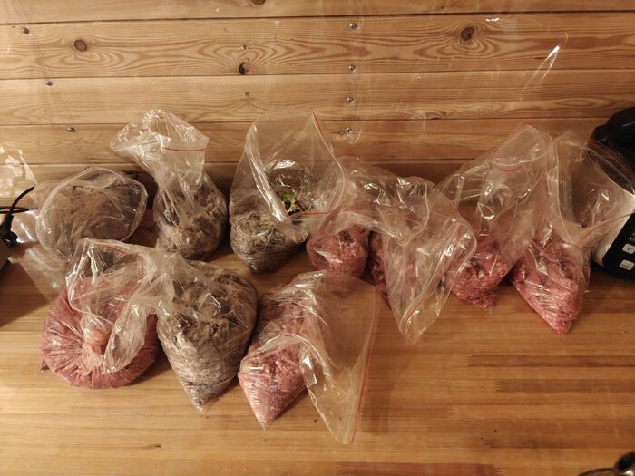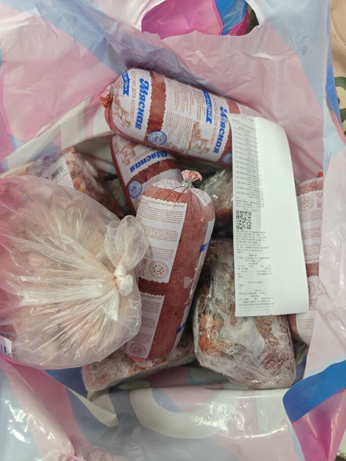 Состав: курица, говяжье лёгкое, куриные желудки, шеи индейки, куриная печень (мало), путассу, скумбрия, псилиум. Все по разным пакетам. Все отправляется в морозилку.