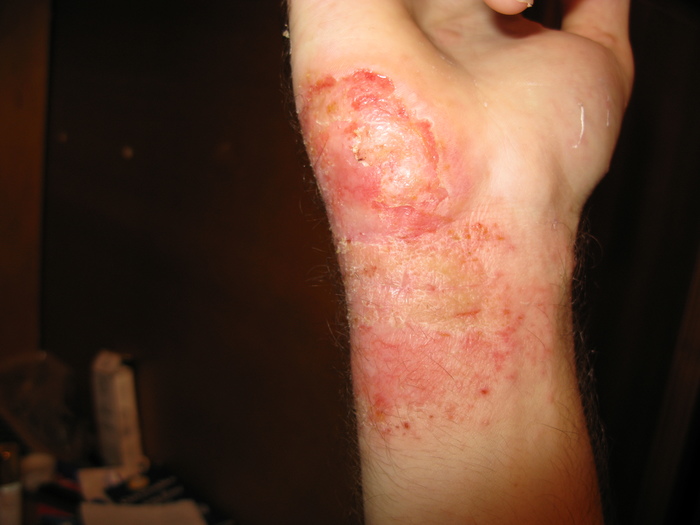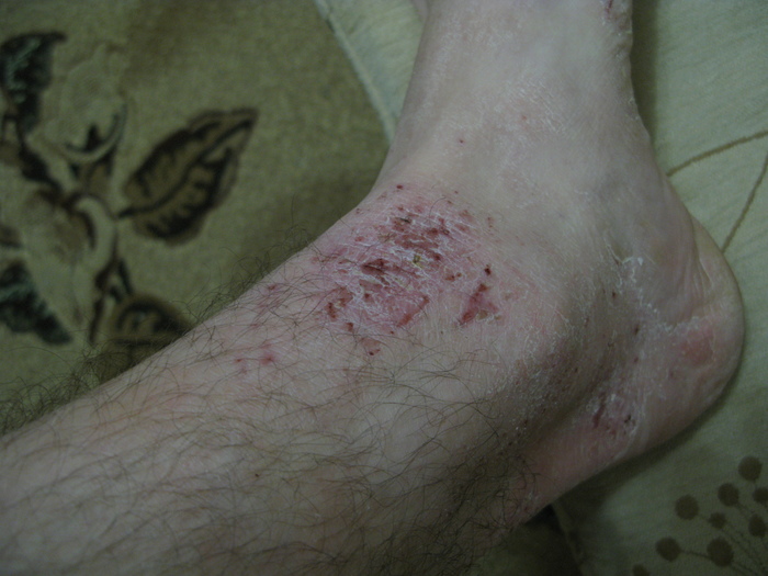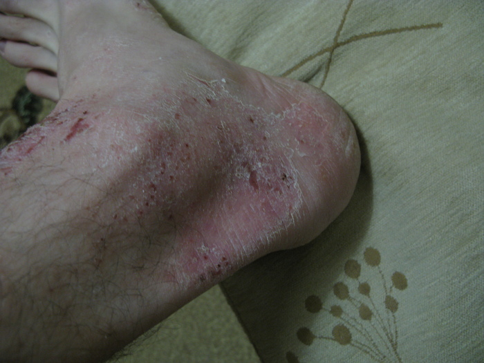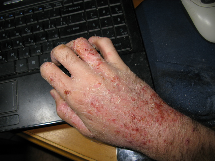 Для тех, кто недостаточно осведомлен, что такое псориаз, то выглядит он примерно так (у меня не на много лучше на груди в самый пик моей болезни):