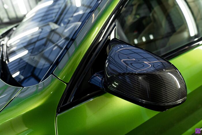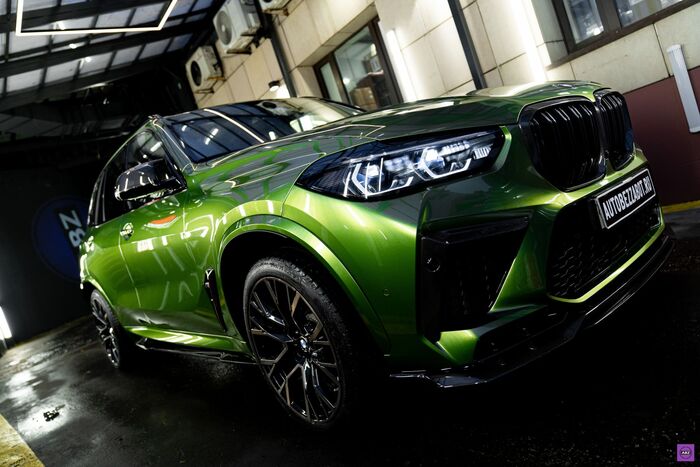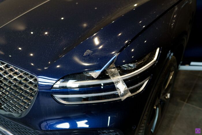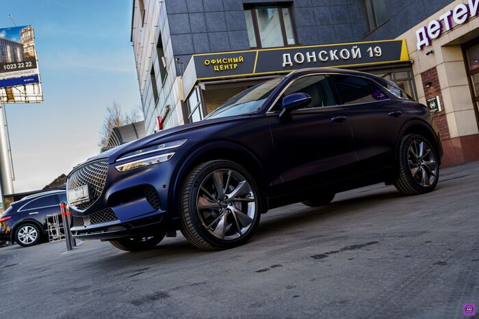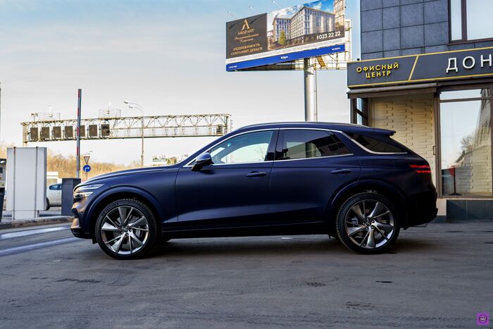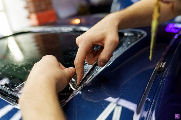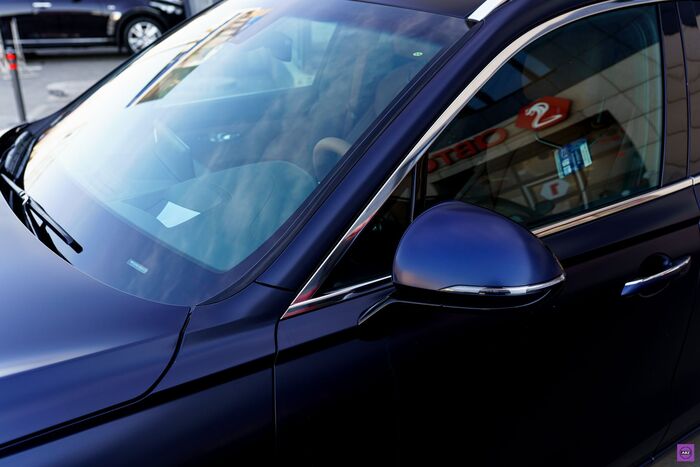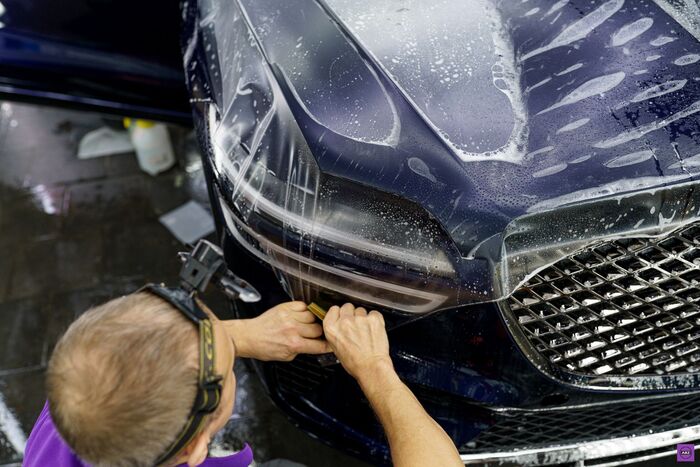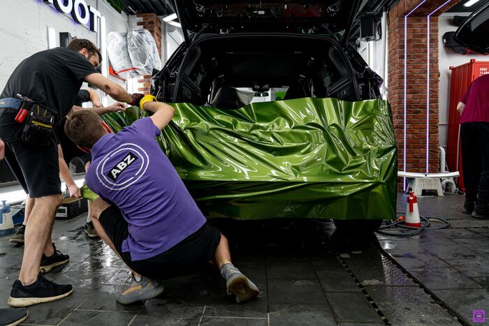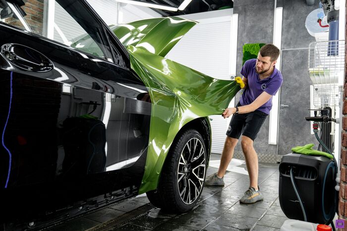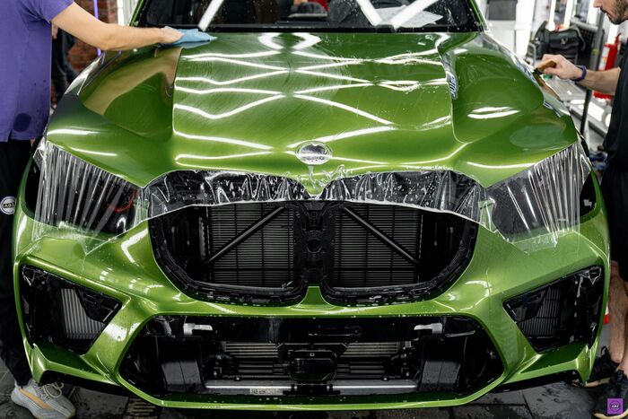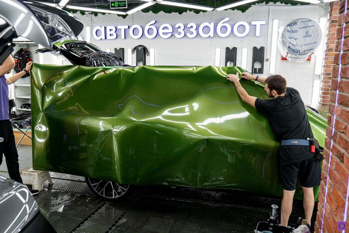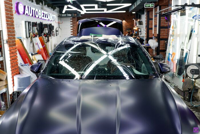 А после — пошла в дело полиуретановая плёнка. Причём не просто так наклеили и забыли. Капот, бамперы, крылья — всё аккуратно закатали, чтобы блестело и не боялось гравия и других неприятностей.