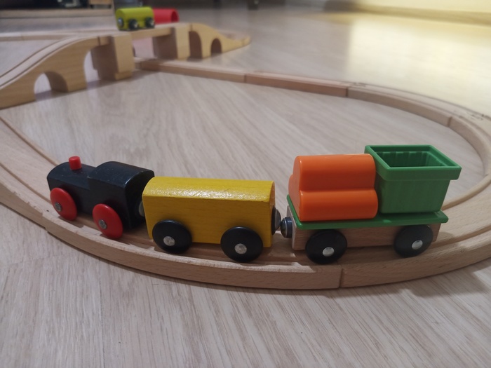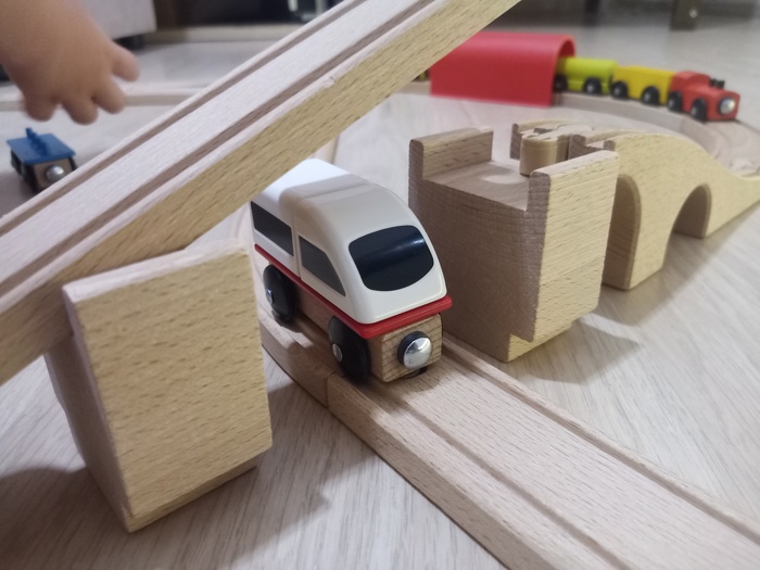 По итогу радость сына от нового поезда очень быстро сменилась разочарованием ... ведь поезд не может проезжать под мостами, а полутора годовалому ребёнку не объяснишь, что дяди и тёти об этом не подумали ...
