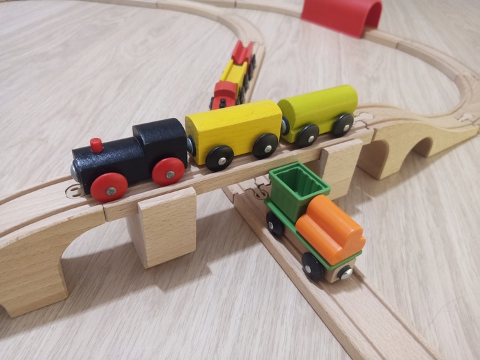 Теперь ранее полностью деревянные поезда и вагоны стали делать комбинированными (дерево + пластик) и соответственно изменились габариты ... но они не подходят для старых наборов, а точнее они не совместимы с мостами ... они под ними просто не проходят