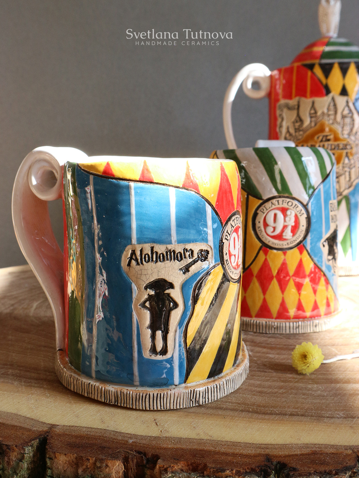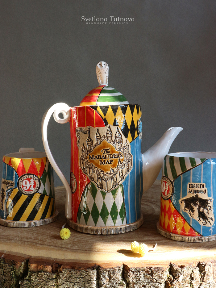Привет! Я Света, я художник-керамист. Сегодня хочу поделиться результатом работы над новым чайным набором по мотивам моей любимой поттерианы. На видео ниже можно увидеть процесс нанесения ангобов (пигментов).