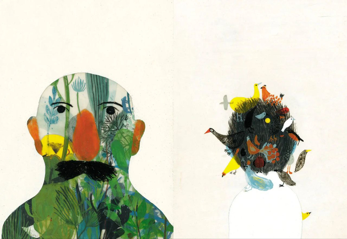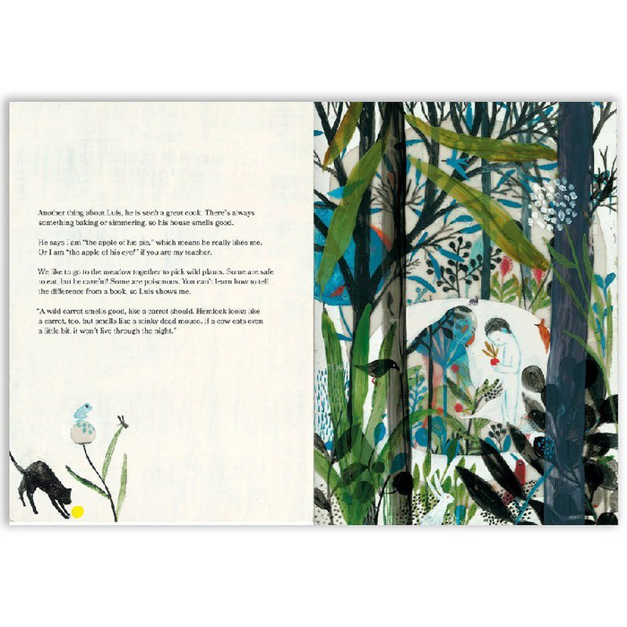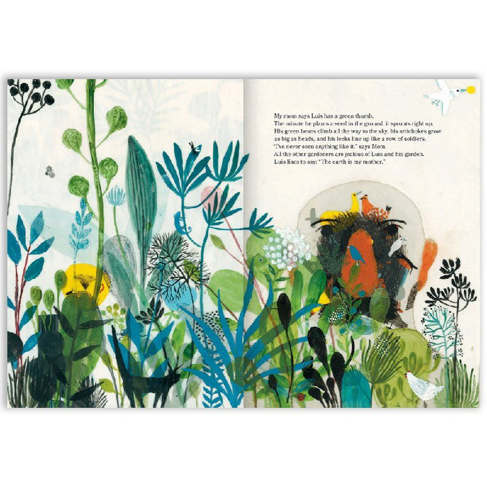 Иллюстрации Виолетты Лопес (Violeta López) к книжке «At the Drop of a Cat», где шестилетний мальчик рассказывает о своем дедушке-эмигранте по имени Луис, с которым он проводит время в саду и узнает от него названия растений и птиц.