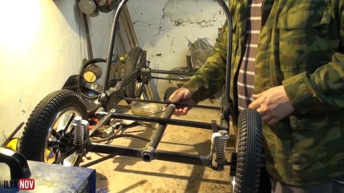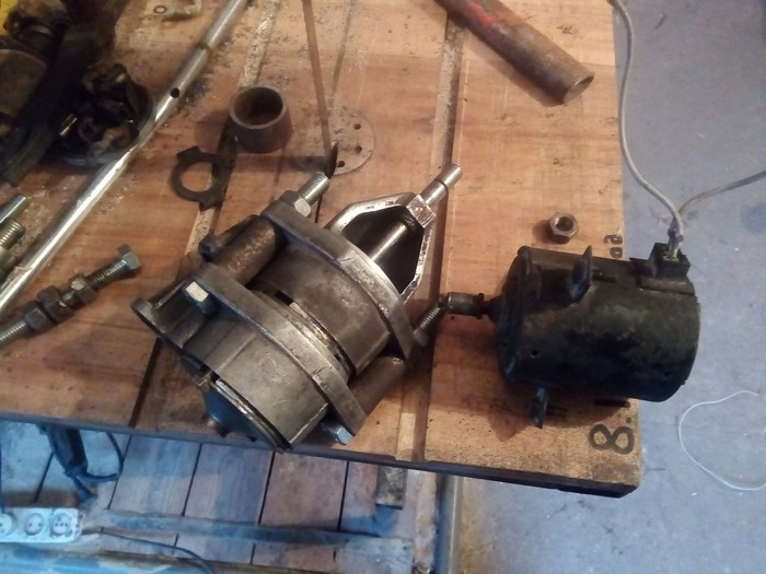 Следуший этап, было придумать что-то путное для роли силового агрегата. Два редуктора от стартеров 2110 были спаренны в один и выдают понижение оборотов в 14 раз и следовательно повышение крутящего момента. В тестовом режиме показал себя хорошо. Есть большая надежда, что все сработает.