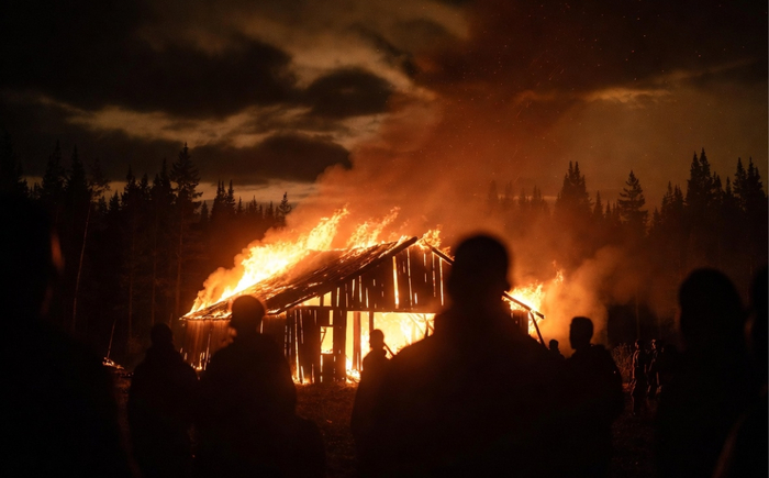К рассвету всё стихло. От сарая только угли дымящиеся остались да запах... тяжёлый такой, тошнотворный, совсем не как от обычного пожара.