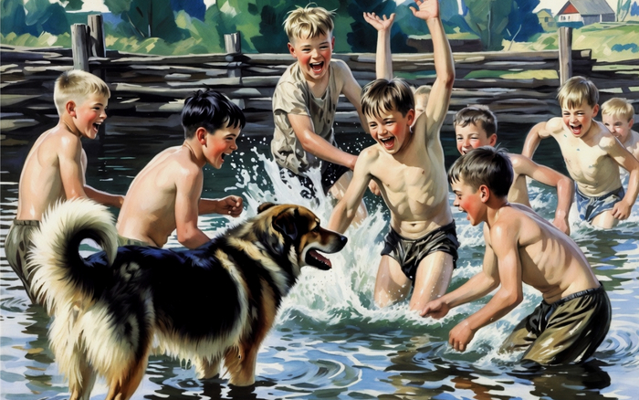 Особенно радовались дети - они носились по зелёным полянам, плескались в реке и устраивали игры помогали по хозяйству. Любимцем всех был пёс Пётр, верный спутник Николая: большой, лохматый, с добрыми глазами и виляющим хвостом. Дети обожали его — то бегали с ним по селу хохоча от восторга, то бросали палки в реку, чтобы Пётр с плеском нырял за ними, то просто гладили его мягкую шерсть, разговария с ним. Пётр был как старший брат: охранял малышей от шалостей, лаял на чужих и всегда был готов к новой забаве. В те безмятежные дни село казалось настоящей сказкой, где счастье витало в воздухе, а беды казались далёкими и нереальными.