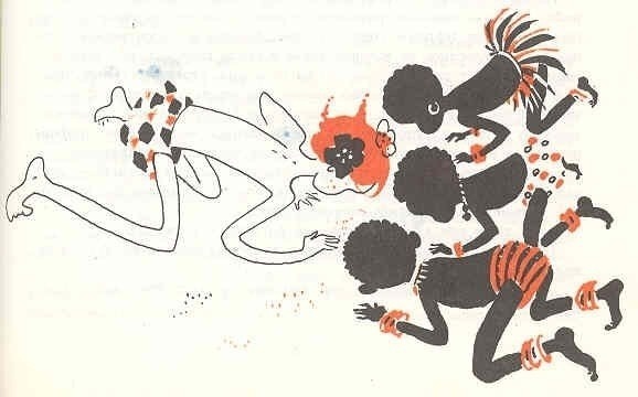Для книжки про Пеппи явно был заказ был на иллюстрации для офсетной печати, а это уже накладывает на художника жесткие ограничения по цвету и графике. Советский офсет - это значит, что бумага будет самая дешевая, практически газетная - поэтому иллюстрации должны быть в один, максимум в два, как "Пеппи", цвета. И рисовать придется без мелких деталей - они на такой бумаге расплывутся нахрен.