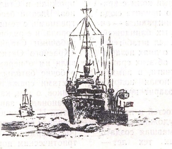 А вот - его иллюстрация к фантастической повести Обручева "Земля Санникова", М.: Географгиз, 1955 г.