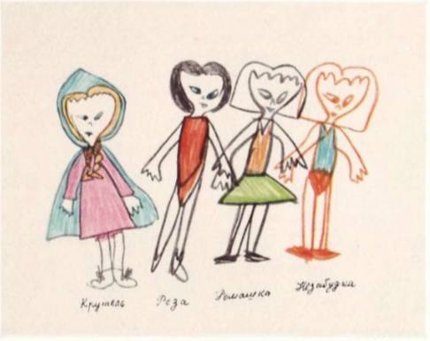 В центре фигура «девочки», по размерам значительно превышающая остальных (огромная голова, чрезмерно длинные трехпалые руки). Больная назвала эту фигуру «страшной, плохой девочкой». Она вытянула вперед руки, чтобы напугать других детей, которые играют «в больницу». А большая девочка сама не знает, как играть, и всех прогоняет. Вторая фигура слева очень вытянутая, опирается на носки и напоминает собой длинную круглую палку, верхний конец которой заканчивается головой в виде символа смерти.