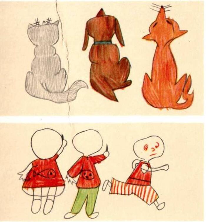 Изображение живых существ спиной к зрителю. Технически рисунок выполнен хорошо. Ясно, что девочка намеренно повернула животных и двоих детей спиной к зрителю. Такие рисунки выражают отчужденность от окружающего мира.