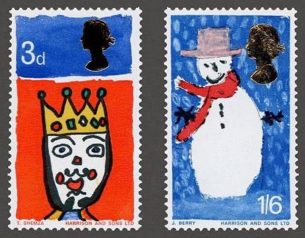 Тонни Бенн. Он через детскую телепередачу объявил о большом детском конкурсе рисунка к Рождеству. В конкурс поступили более 5000 рисунков. Конкурсная комиссия поработала на славу. В результате первые рождественские марки получились вот такими: