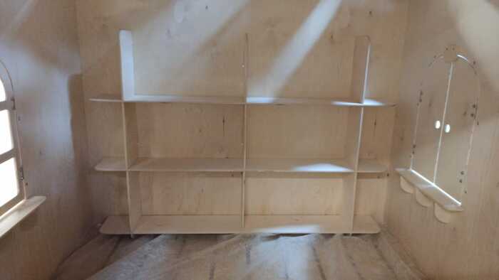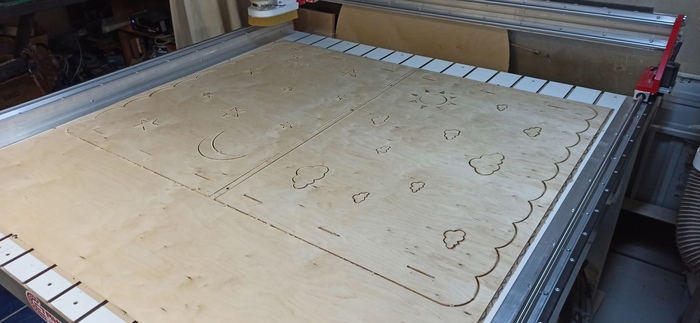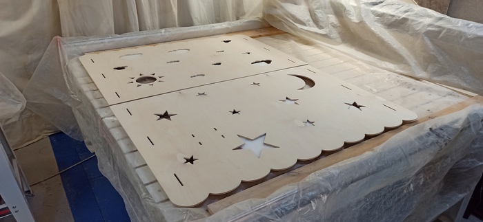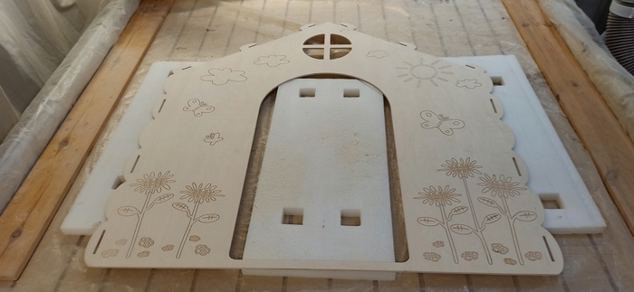 Далее - шлифовка. Наверное, процентов 90 времени изготовления ушло на неё. Домик же для ребёнка, всё должно быть максимально гладко. Все углы и края должны быть закругленны. Ну и визуальная составляющая тоже важна, а при фрезеровке мультяшек всё равно остался ворс внутри. Всё шлифую и закругляю, тут совсем без вариантов. Долго, нудно, но надо))