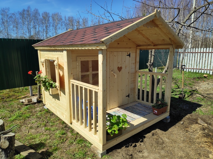 Домик построен по принципу каркасника. "Фундамент" - клееный брус, стены из вагонки, крыша - фанера и две пачки мягкой кровли. Окна купила готовые на местном строительном рынке. Высота по коньку - 180 см, длину-ширину, к сожалению, не помню, да и неважно, наверное. Я обычно скромно говорю, что я всё это сделала сама, но на самом деле, электрику провел мой отец :))